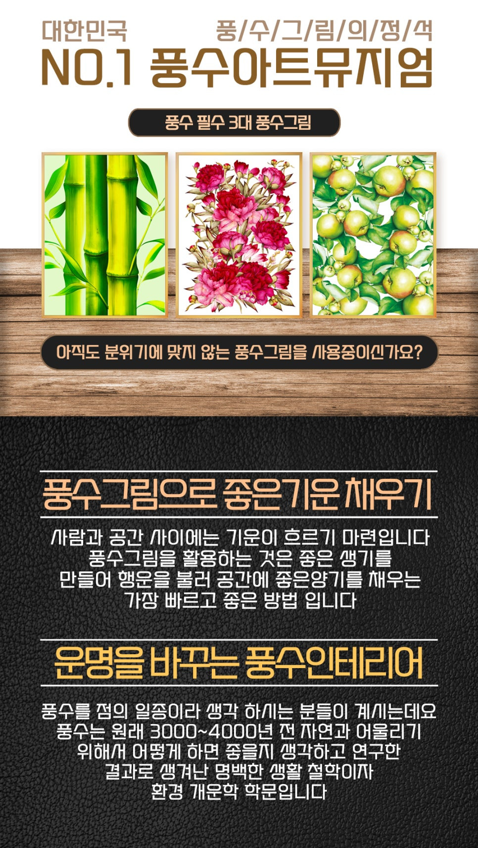 풍수그림 선택 꼼꼼히 체크하세요 풍수 인테리어에서 이야기 하는 풍수그림이란 유행이나 판매가 우선 목적이 되어서는 절대 안됩니다 제작 판매하는 업체가 브랜드가 있고 없고가 중요한 것이 아니라 풍수학적으로 맞지 않는 정보를 무방비하게 맞추어가며 판매하는 풍수그림은 득이 아닌 독이 될수 있음을 알려드립니다. 아트뮤지엄은 오랜기간 연구하고 수집한 양택풍수를바탕으로 풍수인테리 형상확을 접목한 전문 아티스트가 직접 기획하고 작업한 결과물만 제작 판매함을 말씀드립니다. 좋은 기운을 불러 오기위해 그리는 그림, 그건 또다른 인연과의 약속이라 생각합니다